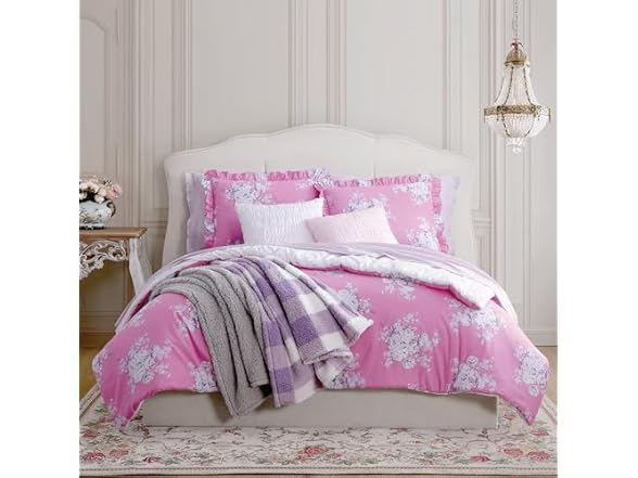 - (1) Shabby Chic® - Queen 3-Piece Comforter Set, Reversible Cotton Bedding with Matching Shams, Elegant Floral Home Decor for All Seasons (Brynn Pink, Queen)