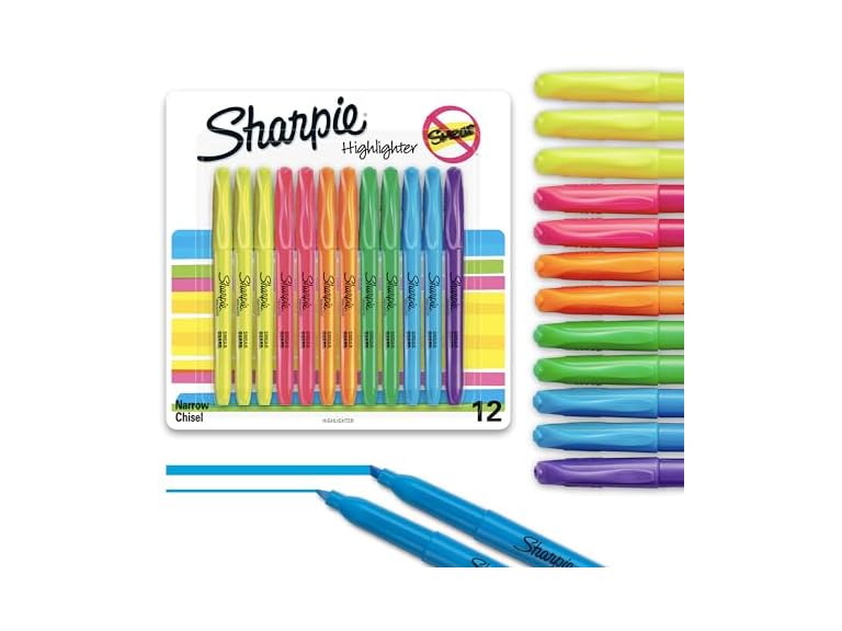 - Sharpie Pocket Highlighters, Chisel Tip, Quick Dry, Assorted Fluorescent Colors, 12 Count - For Studying, Note-Taking, School, College, Office, Student & Teacher Supplies