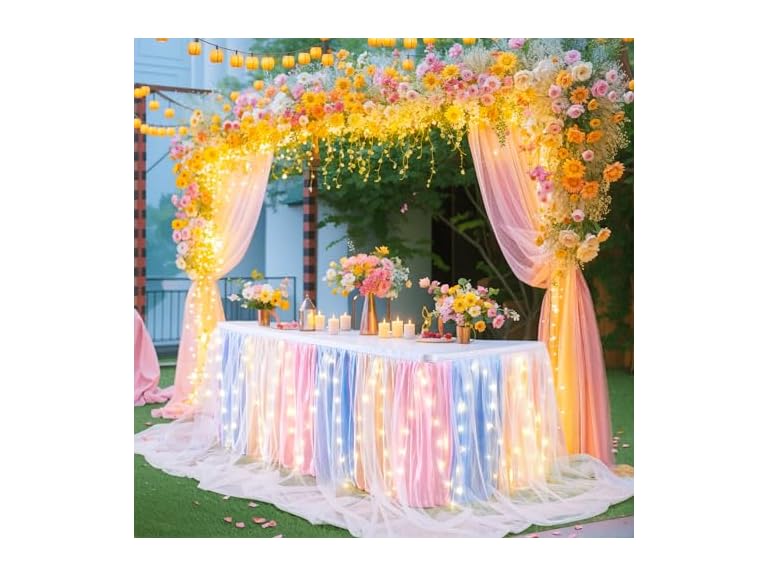- (1) Shillance 17ft Rainbow Tulle Table Skirt for Rectangle or Round Tables, Pink-Blue-Yellow Tutu Table Skirt with LED Light for Baby Shower Gender Reveal Wedding Unicorn Theme Birthday Party Gift Table