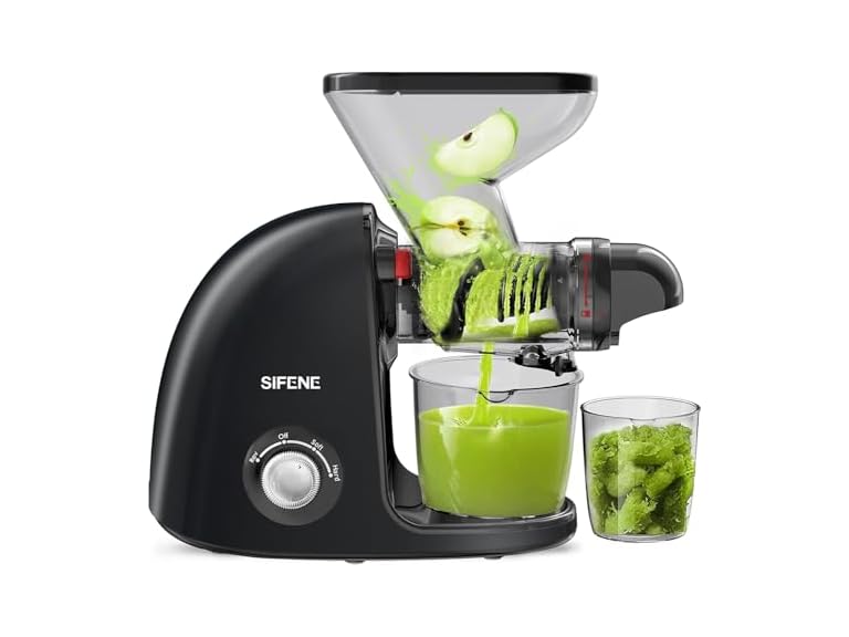 - SIFENE Cold Press Juicer Machine, 2nd Gen Whole Fruit Slow Masticating Juicer with Dual Mouth for Celery & Ginger, High Yield Juice Extractor, Anti-Clog Reverse Function, Quiet Motor, Black