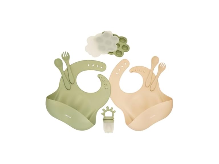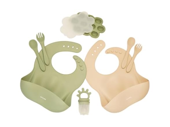 - All-in-One Set: Includes 1 silicone feeder with lid, 1 freezer mold with lid and 10 silicone teats, 2 bibs with deep food catcher, and 2 sets of spoons & forks for convenient feeding.