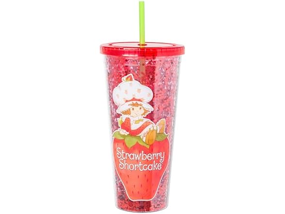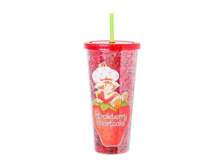 - STRAWBERRY SHORTCAKE: Themed cold cup features Strawberry Shortcake sitting on top of a strawberry. Background of the cup is filled with red glitter and the tumbler is complete with a green straw.