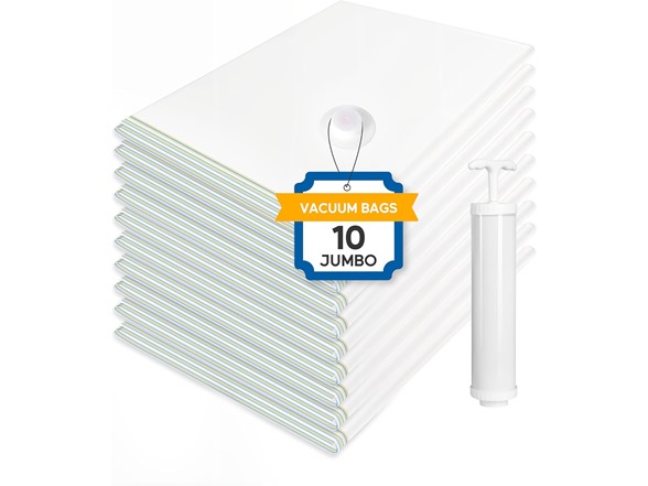 - 10 Pack Package Includes: 10 Jumbo (40"x28"), Hand pump is included. The bags can be used with any vacuum cleaner. Each bag comes with a slider to seal easily.