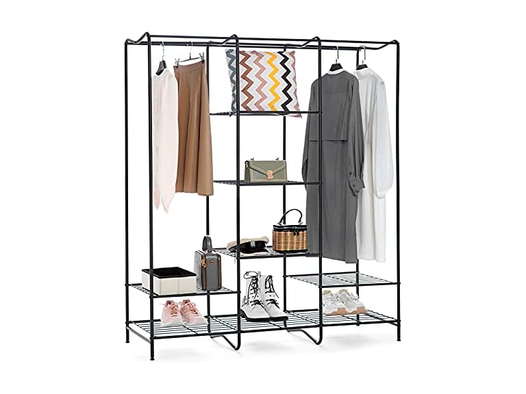 - (1) SimpleWise Freestanding Garment Rack Hanging Clothes Rack Closet Organizers and Storage with 8 shelves Open Wardrobe Rack for Hanging Clothes Heavy Duty Metal, Black