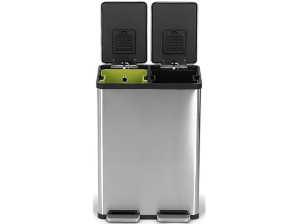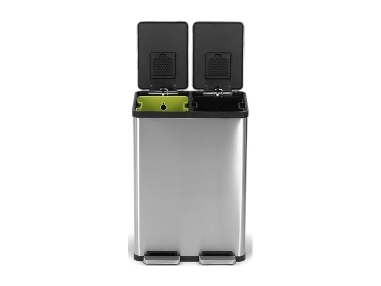 - Simpli-Magic 60 Liter / 16 Gallon Rectangular Hands-Free Dual Compartment Recycling Kitchen Step Trash Can with Soft-Close Lid, Brushed Stainless Steel (30L x 30L Capacity)ā