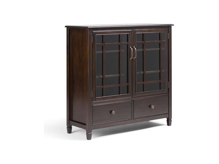 - (1) SIMPLIHOME Connaught SOLID WOOD 46 Inch Wide Traditional Tall Storage Cabinet in Dark Chestnut Brown, For the Living Room, Entryway and Family Room