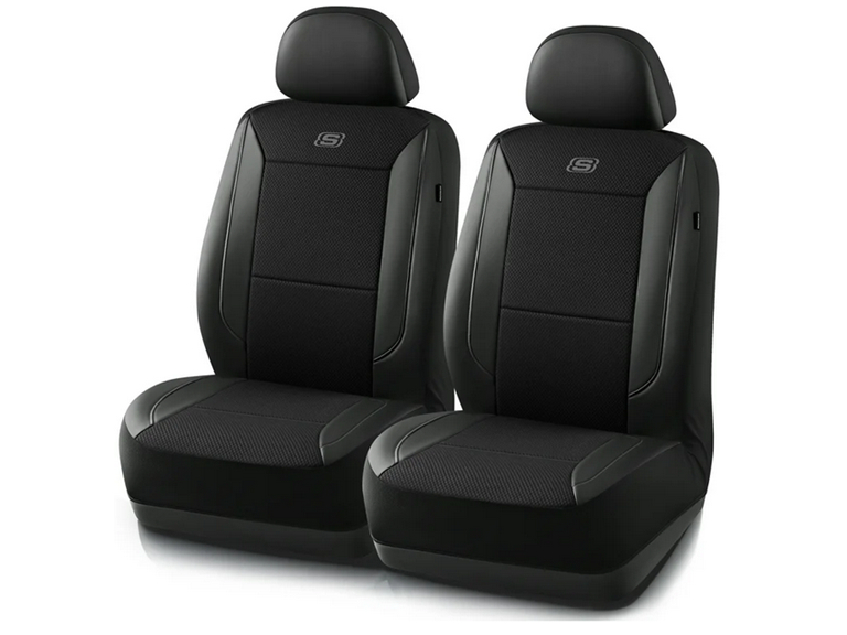 In the box: (1 Pair) Skechers 24SC236 Memory Foam™ Leather Car Seat Covers, Air Cool Mesh Thick Seat Covers - Black