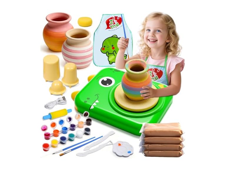 - 🧩POTTERY WHEEL FOR BEGINNERS:Dinosaur pottery wheel toy for kids has complete pottery art supplies with a mini pottery studio,2 sculpting tools toys,4 packs air dried clay,3 clay shaping tools,12 colors,2 brushes, sponge, palette ,apron and other supplies. This kit includes everything you need to shape and color your clay.Creative Crafts for Kids Ages 4–8 & Unique Gift Deals for Girls 8–12.