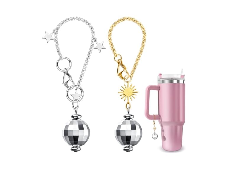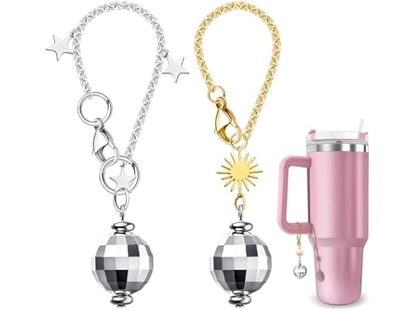 - (1) SlowVibes Stars Sun Disco Ball Charm Accessories for Stanley Tumbler with Handle, 2PCS Mirror Ball Charms for Bag Keychain Purse,30 40OZ Stanley Cup Accessories,Water Cup Handle Pendant,Gift for Women
