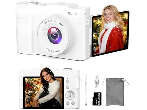 - 4K VIDEO & 50MP PHOTO: This new upgraded digital camera records 4K videos at 30FPS and captures vivid 50MP photos with rich detail. Camera With 16X digital zoom and anti-shake stabilization, cameras for photography delivers steady, crystal-clear results—perfect for vlogs, travel adventures, or everyday memories. Includes 32GB card, share them directly to popular social media platforms like Instagram, TikTok, and Facebook