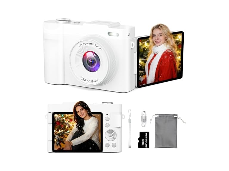 - AUTOFOCUS & 180° FLIP SCREEN: Vlogging camera frame yourself vlog, selfie, repeat no more guessing what’s in frame! Digital camera with a 180° rotatable 2.8” screen, you can see yourself clearly while recording vlogs, livestreams, makeup tutorials, video chats, or just snapping cute selfies. Flip cameras forward, find your light, and press record—it’s that simple. Whether you're a beginner or aspiring creator, you'll love the ease of streaming, filming, or capturing your day