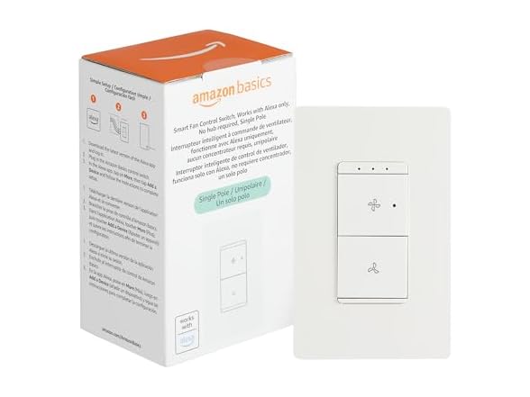 - Amazon Basics Smart Ceiling Fan Control Switch, 4-Speed, Single Pole, Voice Control, Works with Alexa Only, Control from Anywhere, 2.4 GHz Wi-Fi, No Hub Required, White