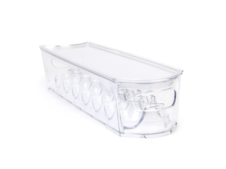 Smart Design Refrigerator Stackable Egg Bin [Clear] Organize your entire refrigerator and instantly create more space using this patented egg bin that holds 14 eggs. Create instant stackable egg baskets for your fridge, kitchen pantry, closets, garage and entire home. Package Includes Refrigerator Stackable Bin Egg Drawer Organizer. Fits most standard size refrigerator shelves; includes a lid to help protect eggs. Great for storing eggs in your refrigerator. Features and Benefits Patented design is made from BPA free plastic making it refrigerator and freezer safe. Holds up to 14 eggs and comes fully assembled for a quick and easy install. Product Specifications Dimensions: 14.65(L) x 4.5(W) x 3.25(H) inches Design: Stackable with Handles Color: Clear Holds: 14 Eggs Material: BPA Free Plastic