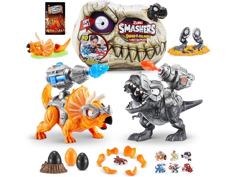 - (1) Smashers Dino Island T-Rex Battles (Black Version) by ZURU 50+ Surprises Boys Collectible 2 T-Rexs and 2 Triceratops to smash, build and battle! Surprise Slime Sand Compounds Discovery
