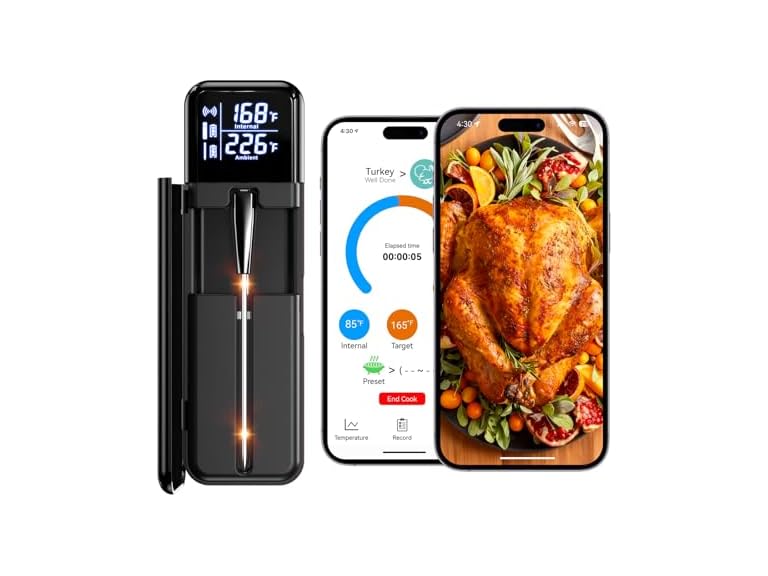 - 🌡️ Dual Sensors & High-Accuracy Probe – Precision at Every Degree This wireless meat thermometer features a ceramic heat-resistant probe with dual temperature sensors to measure both internal meat temp (up to 212°F) and ambient cooking temp (up to 527°F). Achieve steakhouse-level doneness with ±1°F accuracy, whether you’re cooking brisket, poultry, fish, or lamb.