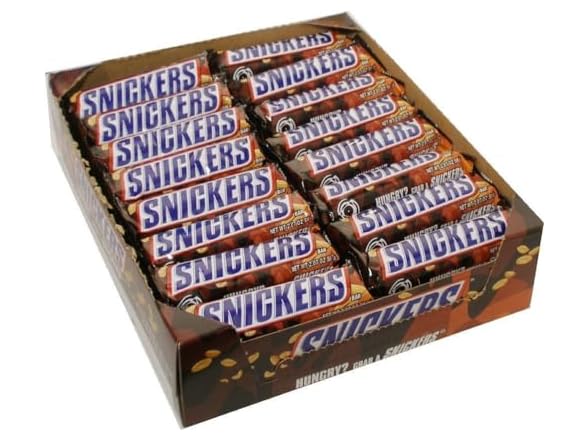 - Individually wrapped chocolate Snickers bars per box; Gluten free