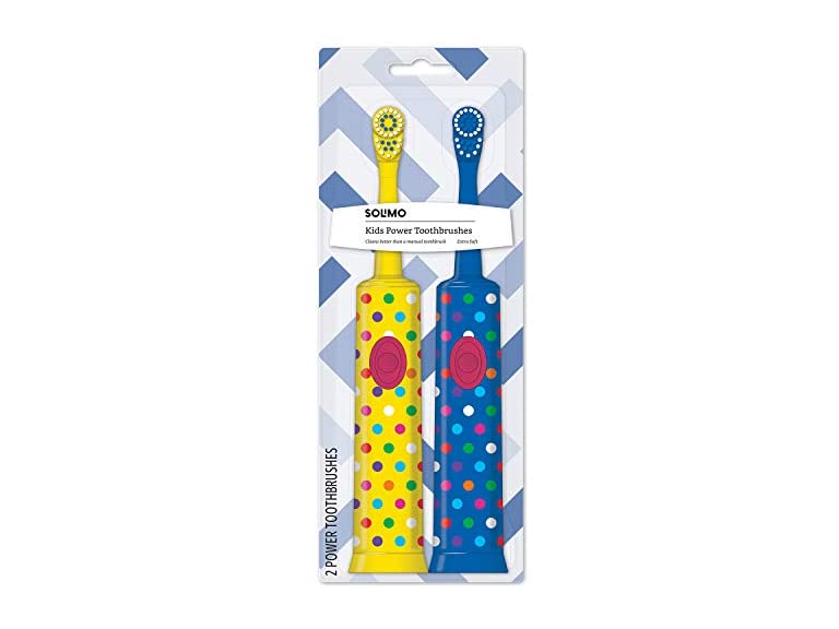 The Solimo Kids Battery Powered Toothbrush cleans better than a manual toothbrush by removing up to 70% more plaque. Featuring an oscillating brush head, this toothbrush provides a gentle, thorough cleaning.