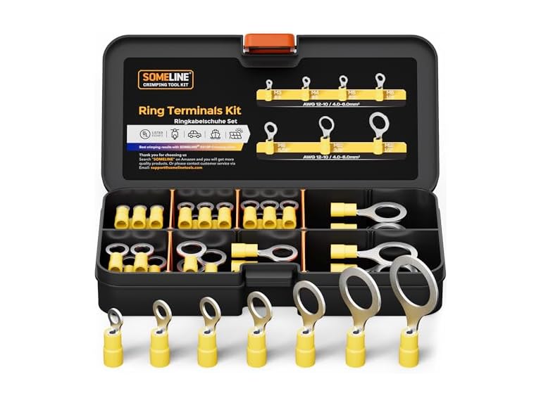 - (1) SOMELINE PVC Ring Crimp Terminals - Yellow #4-1/2"(12-10 AWG) - Insulated Ring Terminal Connectors - Tinned Red Copper - Wire Connectors - 38PCS - UL Listed