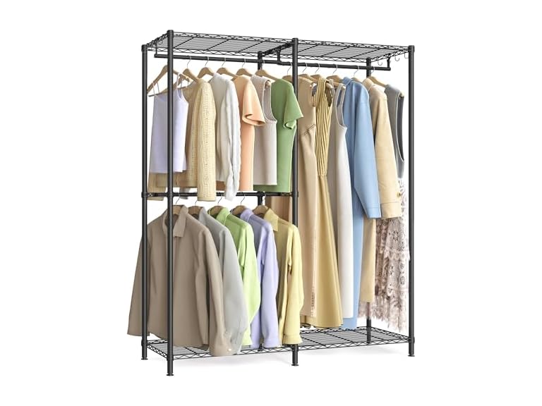 - [Big Capacity, Big Load] With 3 hanging rails and 4 shelves, this garment rack offers oodles of storage for items from outfits to accessories. Each rail can hold up to 55 lb, and each shelf 90 lb, providing a reliable 415 lb total weight capacity
