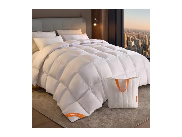 - (1) SONGMICS HOME Down Comforter, Soft Down Duvet, King Size Duvet Insert, Feather Comforter with Corner Loops, 65 oz Filling, for All Seasons, Winter, Hotel, 106 x 90 Inches, Cloud White