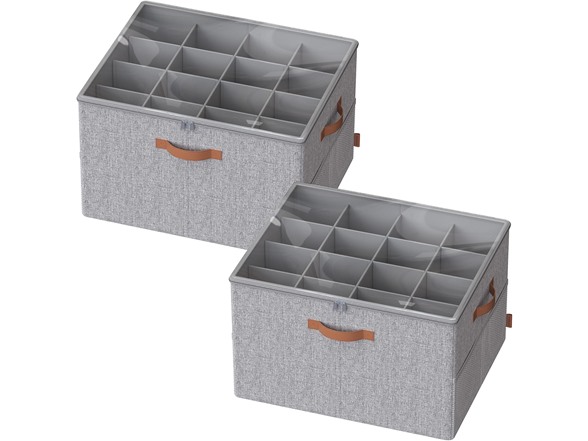 (1) SONGMICS Shoe Organizers for Closet, Pack 2 Shoe Storage Bins, Fits 32 Pairs, Fabric Containers with Handles and Clear Cover, Adjustable Dividers, Customizable, Dove Gray