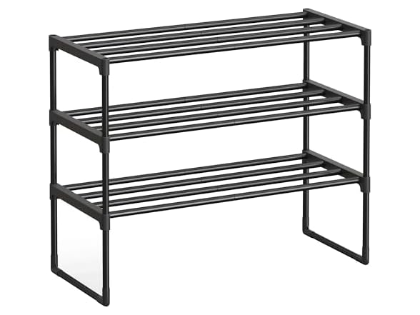- (1) SONGMICS Shoe Rack, 3-Tier Shoe Organizer, Metal Storage Shelf, Upright or Upside Down, for 8-12 Pairs, Stackable, for Entryway, 11.8 x 26.8 x 21.7 Inches, Black ULSA203B01