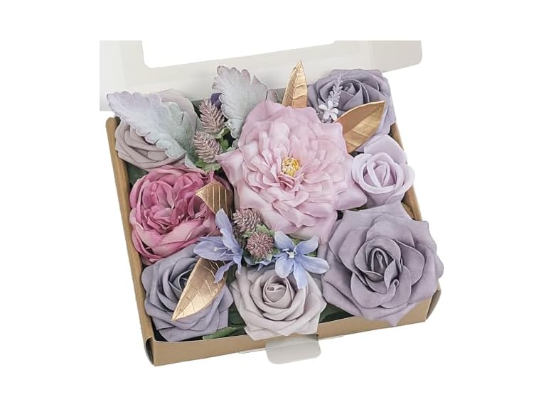 - Sonnetale Artificial Flowers and Greenery Combo Box Set, Fake Flower for DIY Wedding Bridal Bouquet, Centerpieces Party Engagement Floral Arrangement Decor (Gold & Lavender, Mini)