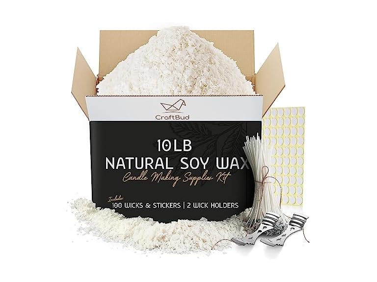 - (1) CraftBud Soy Candle Wax for Candle Making ‚Natural Soy Wax for Candle Making 10 lb Bag, Candle Making Wax, 10 Lbs. Soy Wax Flakes, 100 Candle Wicks, 100 Wick Stickers, and 2 Metal Centering Devices