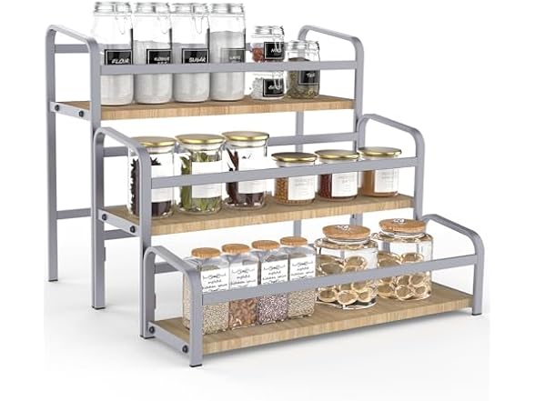 - ⭐【Stable Structure 】The spice rack has painted wood step and metal frame ,every ,Organize not only spice bottles & jars, also vitamin bottles & essential oils and store cosmetics like lipstick and nail polish, make things visible and accessible, keep cabinet pantry or cupboard tidy