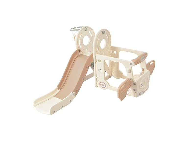 - SPOFLYINN Toddler Slide Swing Set with Bus Play Structure Freestanding Climber Swing Playset with Basketball Hoop for Boys Girls Birthday Xmas Gifts Beige