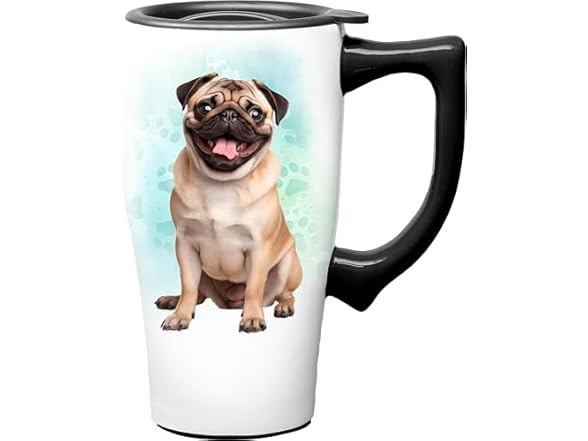 - (1) Spoontiques Pug Ceramic Travel Coffee Mug with Lid and Handle - Spill Proof Lid - Double Walled Mug for Hot and Cold Beverages - Microwave and Dishwasher Safe