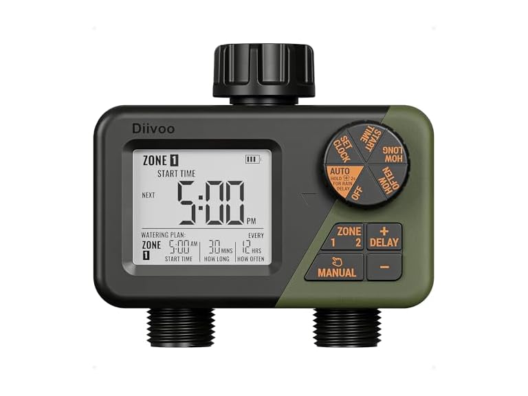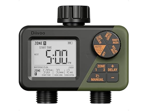 - Multi-Functional Irrigation Timer: The Rain Delay Mode lets you suspend watering for 1 to 7 days to prevent over-watering and conserve water during rainy periods. Manual Watering mode allows you to water temporarily without interrupting the preset watering program. (Note:Diivoo dual Hose timer without rain sensor, so you can postpone your schedule by the local weather forecast)