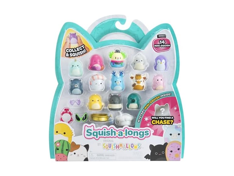 - (1) Squish-a-longs 14 Pack - Series 2, Wave 1 - (14) 1” Mini-Squish with (4) Accessories, (1) Ring Attachment, and (1) Collector’s Guide - Collect, Trade, & Play