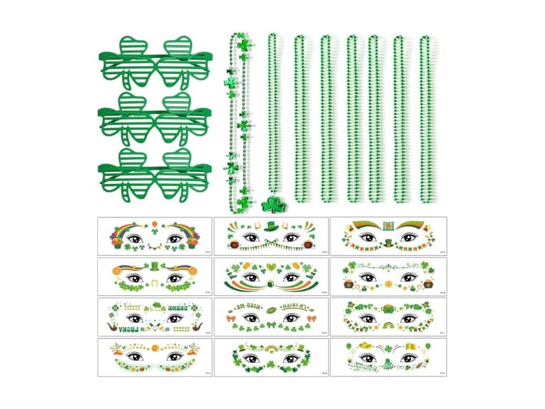 - ST. Patrick's Day Set: This St. Patrick's Day Party Favor Dressing-up Accessories Set includes 3 shamrock glasses, 8 necklaces, and 12 tattoo stickers, these St. Patrick's Day dress-up accessories will create unique festival decorations for yourself and your friends,making you stand out in the crowd