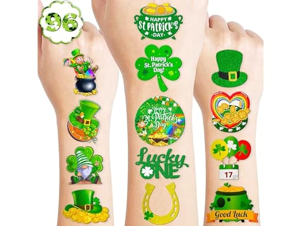 - (1) frawharmone 96 PCS Irish Lucky Saints St Patricks Day Temporary Tattoos Themed Birthday Party Decorations Supplies Favors Decor Leprechaun Green Shamrocks Tattoo Stickers Gifts For Kids Boys Girls School Prizes