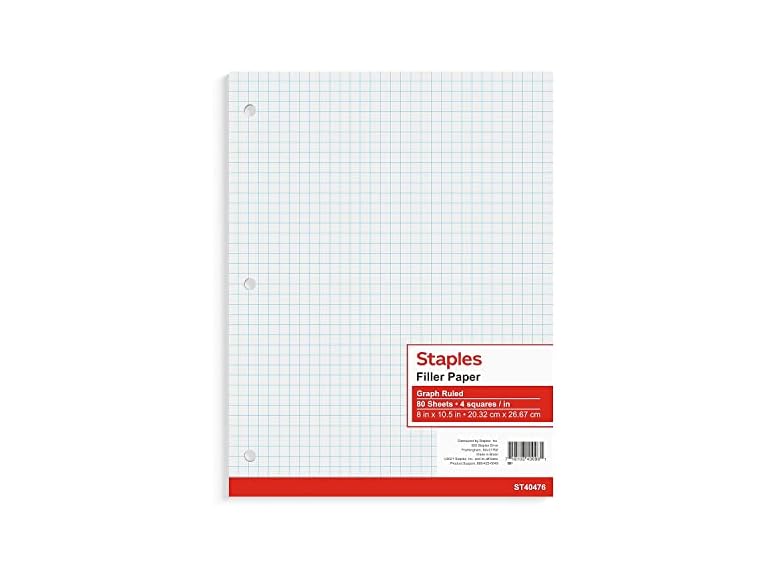 - (1) Staples Graph Ruled Filler Paper, 8-inch x 10.5-inch, 3-Hole Punched, White, 240/Carton (ST40476CVS)