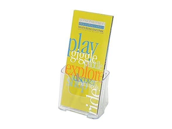 Provide office visitors with easy access to reading materials using this Staples brochure-size literature holder. Display brochures, maps or pamphlets with this Staples brochure-size literature holder. Clear construction makes your reading materials easy to see, while the compact size fits neatly on tables or desks. This Staples brochure-size literature holder features rounded edges for a contemporary look. Literature wall holder lets you conveniently display signage to ensure maximum visibility. Clear plastic makes for durability and better visibility. Dimensions: 7.75H x 4.38W x 3.25D. Displays material up to 4.25W. Can be placed on walls and desktops or mounted on a wall for easy viewing The Staples brochure-size literature holder is an accessory with a job to do. It displays your marketing materials to clients and business associates. The clear design makes it easy to see the entire brochure, and the holder fits right on your desk for convenience. Convenient Desktop DisplayArrange your brochures in this smart accessory to make them accessible to incoming visitors. Brochures are held upright and are clearly visible, catching clients' attention and ensuring you can quickly find marketing materials to distribute when unexpected opportunities arise.Transparent DesignThe Staples literature holder has a transparent body to allow passersby to see brochures from top to bottom. The clear finish and rounded details also offer a contemporary look that's appropriate for professional settings. Durable ConstructionFirm plastic forms the base of this handy literature holder. With thick edges and sturdy surfaces, the Staples holder provides enough durability to withstand the inevitable tumbles that can occur when navigating cluttered desks.
