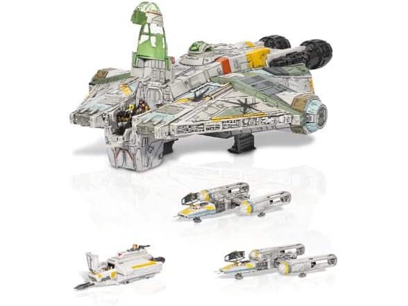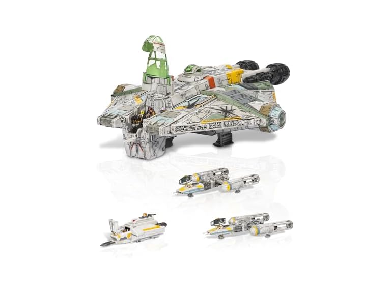 After openly challenging the Emperor, Senator MON MOTHMA was marked as a traitor. Upon fleeing the IMPERIAL NAVY, she teamed up with the Ghost and GOLD SQUADRON enroute to DANTOOINE. The two groups fought off the Empire and led her to safety where she formally launched the REBEL ALLIANCE. Recreate this pivotal operation or assign brand new missions with the STAR WARS Micro Galaxy Squadron Ghost (Secret Mission). This Amazon exclusive bundle is packed with kid-friendly action features to help boys and girls (8+) discover the excitement of the STAR WARS galaxy. Ignite their imagination with four unique starships: 15-inch Ghost (Secret Mission) with motion and button activated lights, battle damage scoring, and unique interior deco, 6-inch Phantom Shuttle, 7.5-inch GOLD LEADER’S Y-WING, and 7.5-inch GOLD THREE’S Y-WING with exclusive deco. The three smaller ships can securely dock with the Ghost with the Y-wings attached to its right and left airlocks and Phantom Shuttle above its engines. It also includes a Flight Display Stand that allows you to showcase the Ghost with all three ships attached. Finally, play out these epic adventures with the following 1-inch micro figure accessories of HERA SYNDULLA, KANAN JARRUS, SABINE WREN, GARAZEB ORRELIOS, C1-10P (CHOPPER), EZRA BRIDGER, JON VANDER, R2-BHD, TYSON (GOLD THREE), and R5 ASTROMECH, compatible with all other STAR WARS Micro Galaxy Squadron vehicles. Form up and take flight with the Ghost…and recreate its secret mission!