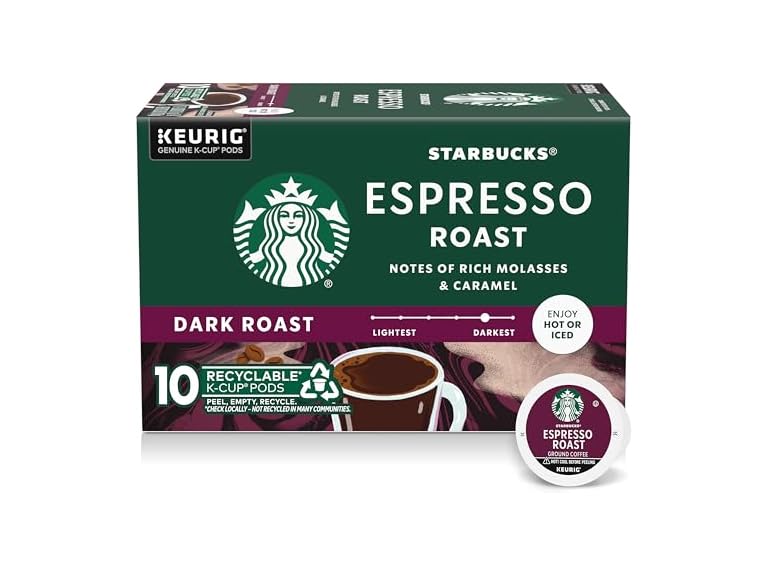 - Starbucks K-Cup Coffee Pods, Dark Roast Coffee, Espresso Roast for Keurig Coffee Makers, 100% Arabica, 1 Box (10 Pods)