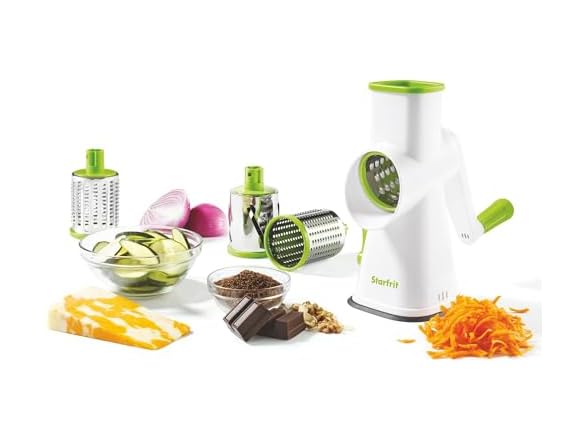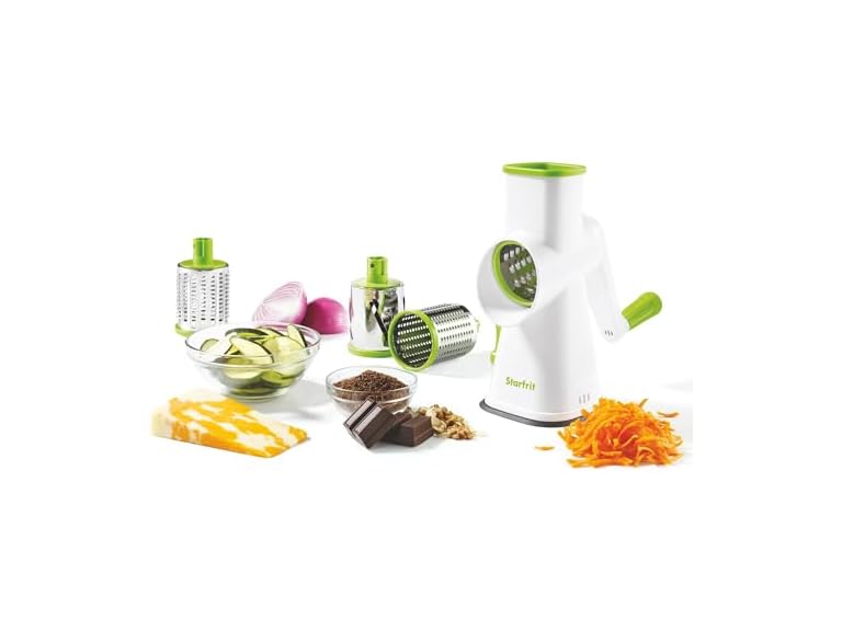 - Starfrit Rotary Drum Grater - 4 Interchangeable Stainless Steel Drums - Slicing, Coarse and Fine Grating, Ice Shaving - Great for Vegetables, Cheese, Nuts, Chocolate