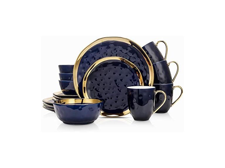 - Glamorous navy blue porcelain dinnerware with bold gold trim and pebbled texture makes a stunning statement on any table. A luxurious choice from Stone Lain that elevates everyday meals.