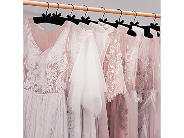 - Each hanger is crafted with a soft satin finish over a plush sponge padding and a sturdy wooden core. The built-in elegant bow and swiveling chrome-plated hook add a touch of luxury and functionality.
