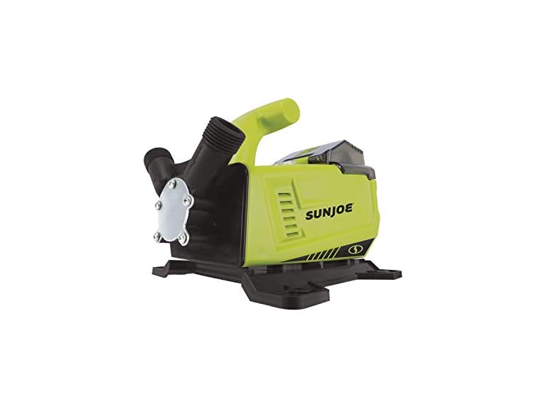 Tool Only - Battery and Charger Sold Separately. PORTABLE PUMP POWER! Drain your basement, boat, toilet tank and more with the Cordless Transfer Pump from SUN JOE. Powered by the exclusive IONMAX lithium-ion battery system, the Sun Joe transfer pump offers up to 20 minutes of pumping performance with a 2.0 Ah battery (sold separately in tool only model). The 150-Watt, eco-friendly motor pumps up to 330 gallons of stagnant or standing water per hour to easily drain fish tanks, water heaters, bird baths, backed-up tubs and sinks, flooded basements, fountains and more. The 5.9-feet long suction hose pulls water up to 13-feet and transfers it to your area of choice. And the included puddle strainer accessory is perfect for cleaning up flooded, leaky areas. Plus, Sun Joe's self-priming system and overheat protection keeps you and your pump safe during operation. So, pump it up and Go With Joe® — the 24V-XFP5-CT Cordless Transfer Pump from SUN JOE®. GET EQUIPPED®.- [SELF-PRIMING PUMP]: Transfers up to 330 gallons of still or stagnant water per hour