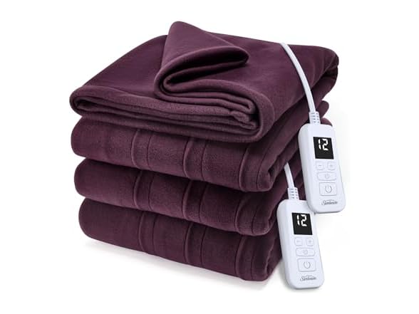 - (1) Sunbeam Royal Ultra Fleece Heated Electric Blanket King Size, 90" x 100", 12 Heat Settings, 12-Hour Selectable Auto Shut-Off, Fast Heating, Machine Washable, Warm and Cozy, Claret