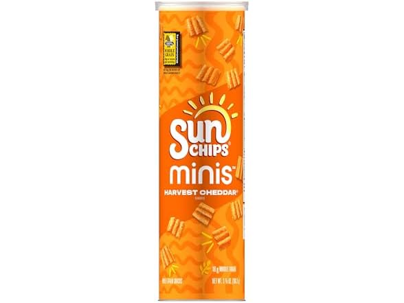 - Includes 1 (3.75 oz) canister of SunChips Minis, Harvest Cheddar flavored Whole Grain Chips