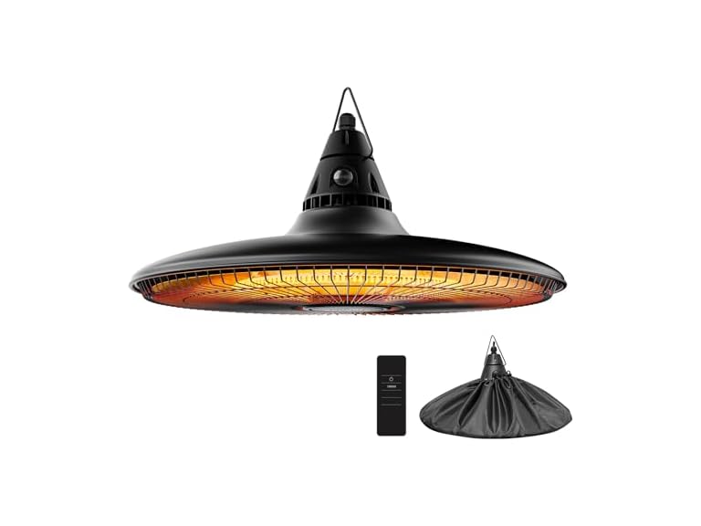 - Light Weight & Adjustable Chain: The weight of 4.96 pounds makes the outdoor heaters for patio easy to carry and assemble, which is convenient for you to change the heating location. Also, the 22 inches chain allows you to adjust the heater height. Please NOTE: The distance between the bottoms of the hanging patio heater to the Floor must be over 5.9 ft, and the distance between the heater and ceiling must be at least 1 ft