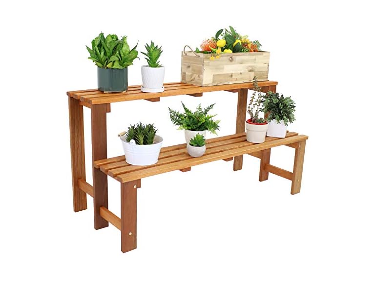 - STYLISH MERANTI CONSTRUCTION: Made of durable yet lightweight meranti wood with a stylish teak oil finish, this plant shelf has a classic design that will complement any decor style.