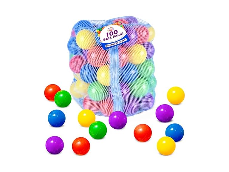 - (1) Sunny Days Entertainment 100 Count Multi Colored Play Balls – Phthalate and BPA Free Non-Toxic Crush Proof Plastic Ball Pack - Balls for Toddler Ball Pit in Reusable Storage Bag with Zipper