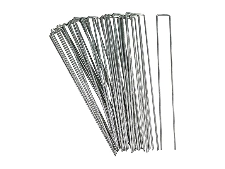 These garden staples are an essential tool for securing landscape fabric, plastic, fence bottoms, dog fences, plants, canopy tarps, among other uses (especially useful for special events). With this pack of 25, there won't be any loose ends. Engineered to last, their galvanized steel construction makes the staples durable against all weather conditions including rain, sun, and snow. Spanning 12" in length and with a U-shaped design, these garden staples are easy to insert into the ground and are built to last all day and night, staying steady in the ground easily. Quickly anchor down any gardening tools, loose hoses, landscaping that needs tending to, tents during camping trips, tubing lines, chords, and more. These garden staples not only organize your things but keeps them safely attached to the ground. These staples can be used in the grass, turf, artificial grass, and any other soft, spongy ground material.
