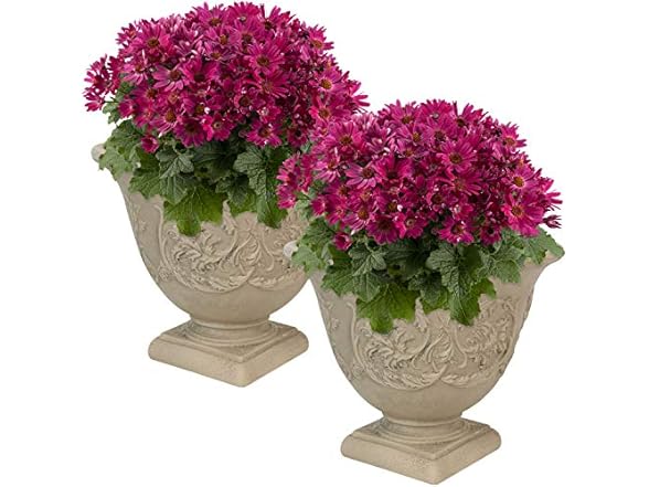 - AMPLE GROWING SPACE: This garden planter urn has a 16" outer top diameter, 6" inner bottom diameter, 13" outer height, and 11" inner height. The base measures 7" W x 7" D. The planter weighs 3 lbs. It can hold 4.8 gallons/0.65 cubic feet/19.3 quarts. The large size makes this planter great for growing plants and flowers both inside and outside.